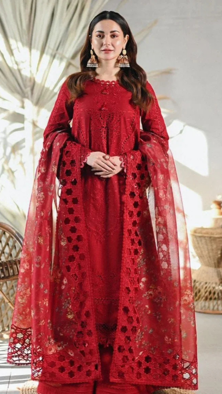 LAWN 3PC CHIKENKARI EMBROIDERED SHIRT PLAIN TROUSER (D-PATCH ) ORGANZA CUTTWORK HEAVY PALU DUPATA D-506